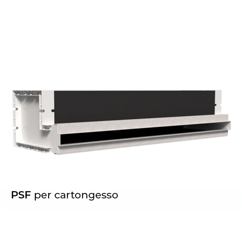 I PSF sono plenum completi di diffusore a feritoie a scomparsa, senza cornice, completo di due alette deflettrici nere interne. Realizzati con pannello in poliuretano espanso rigido di densità 49 (+/-2) kg/m3.