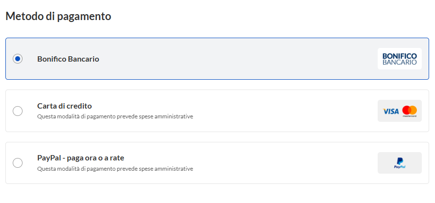 4. Seleziona il metodo di pagamento tra: Bonifico Bancario, Carta di credito o PayPal (se vuoi usufruire anche delle detrazioni IRPEF il pagamento deve essere effettuato con "Bonifico bancario parlante").
