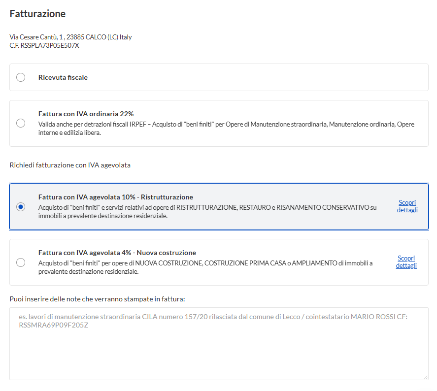 Clicca su “Modifica tipo di fatturazione”, poi su “Richiedi fatturazione con IVA agevolata”. Infine seleziona “Fattura con IVA agevolata 10% - Ristrutturazione”. È anche possibile aggiungere eventuali note o informazioni da inserire in fattura.