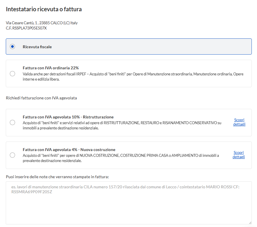 Scegli tra ricevuta o fattura con IVA ordinaria al 22%, oppure richiedi una fattura con IVA agevolata al 10% o al 4%. È anche possibile aggiungere eventuali note o informazioni da stampare in fattura.