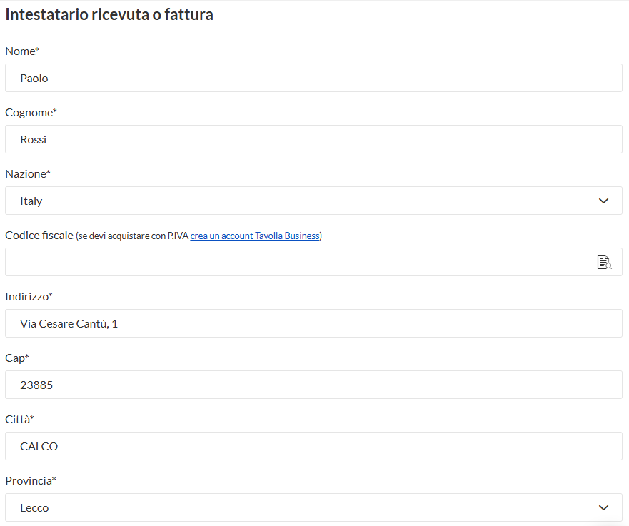 4. Inserisci i dati dell'intestatario della ricevuta o fattura.