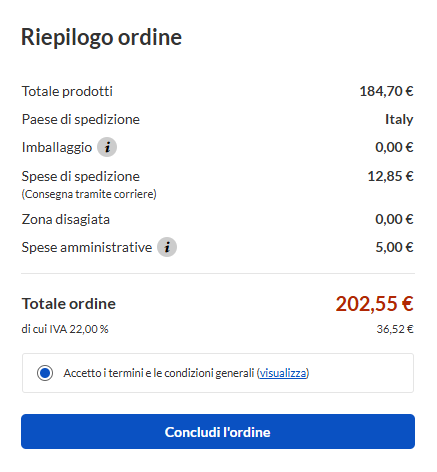 9. Controlla che non ci siano errori, accetta i termini e le condizioni generali e infine clicca su "Concludi l'ordine" per completare il processo d'acquisto.