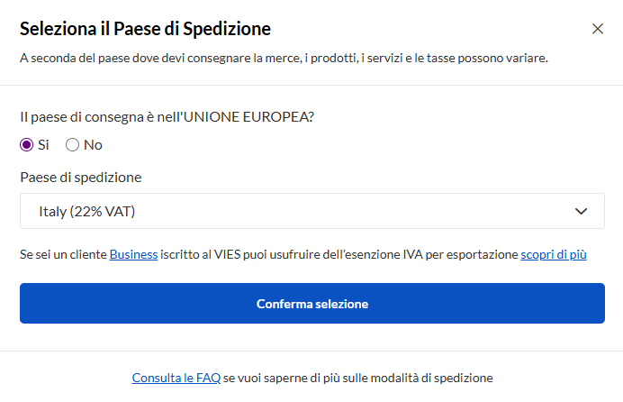 Prima di iniziare ad acquistare, seleziona il paese di spedizione per visualizzare i prezzi con l’IVA corretta.
