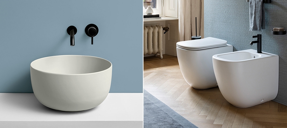 La serie Era di Cielo, disegnata da Luca Cimarra, combina eleganza geometrica e innovazione con la tecnologia di scarico Rimless2.0, offrendo soluzioni compatte e versatili per un bagno moderno e funzionale.