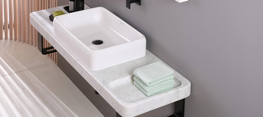 La possibilità di personalizzazione del tuo bagno assume diverse forme con la consolle in pietra Qatego, disponibile in tre colori e tre versioni: Marmo di Carrara, Travertino e Pietra Lavica. La pietra naturale italiana delle consolle Qatego è estremamente resistente e facile da pulire, inoltre il design segue le forme delle ceramiche, per questo il piano d'appoggio è disponibile unicamente in coppia con i lavabi Qatego.