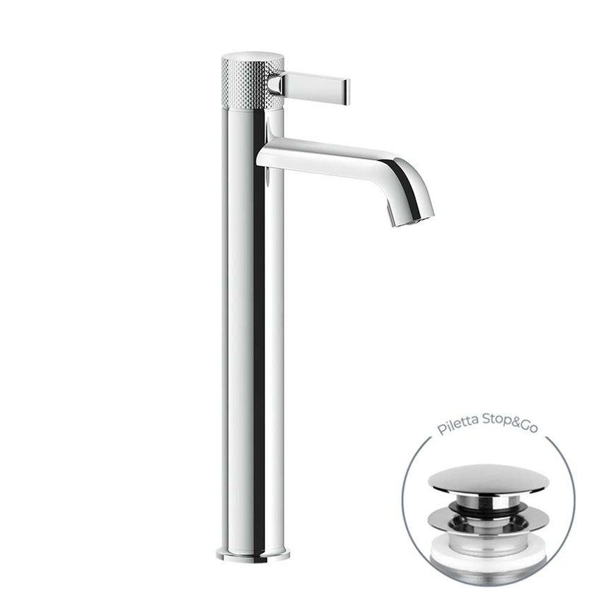 Rubinetto monocomando Appoggio Gessi Inciso 58003#031, disegnato da David Rockwell, stile Moderno, forma Rotondo, in Ottone, Bocca Fissa, Mono Foro, Piletta click-clack, lunghezza cm 18.2, altezza cm 33.8, finitura Chrome