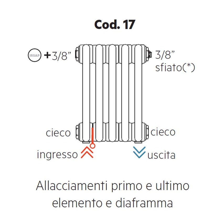 Irsap configurazione con allacciamenti idraulici e tappi montati, primo e ultimo elemento e diaframma, 3/8" sfiato Cod.17