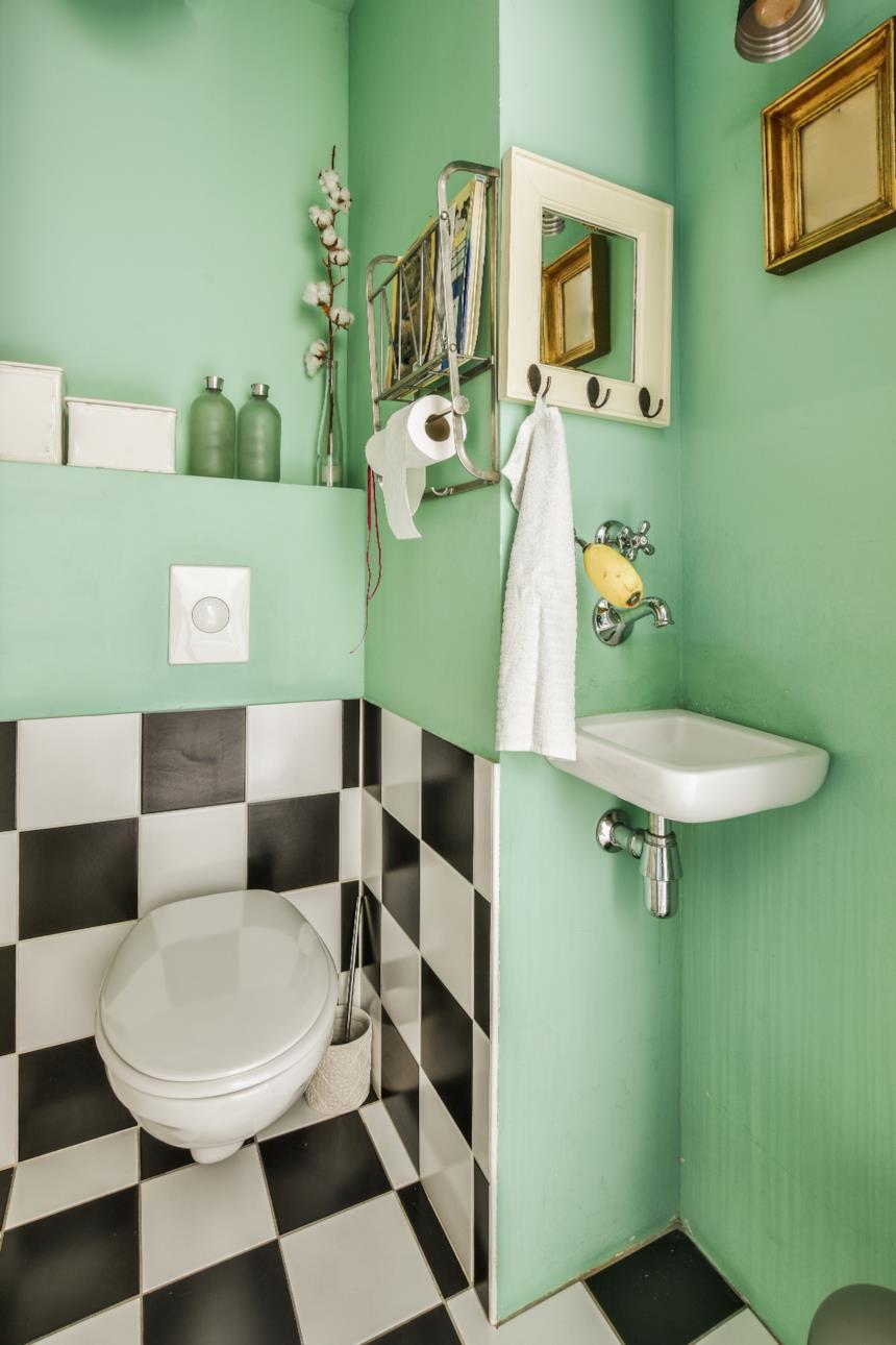 Per l’illuminazione opta per applique vintage e magari per una plafoniera a neon. Non dimenticare le tende, se il tuo bagno ha una finestra, che dovranno essere di un tessuto spesso e naturalmente colorato.