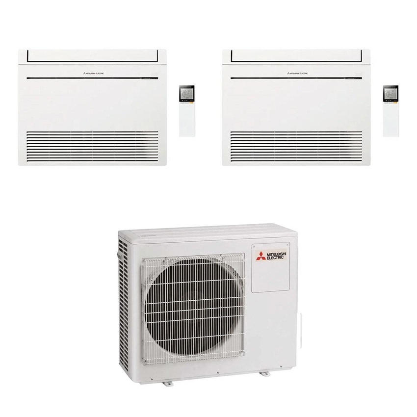 dual split Mitsubishi MFZ-KT Console, posizionamento A pavimento, pompa di calore, inverter, BTU 9000+9000, potenza caldo kW 8.6, potenza freddo kW 7.2, con sistema Wi-Fi, gas refrigerante R32, comando Sì, finitura Bianco